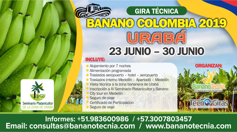 Participa del seminario «Sistema de Producción de Banano y Seminario Platanicultor y Banano 2019”. Una excelente oportunidad para conocer de cerca los modelos de producción de banano de Urabá, zona más importante de banano en Colombia.Colombia exporta un total de 100 millones de cajas de banano por año y estas exportaciones representan casi 860 millones de dólares. Así se convierte en el segundo país más importantes de Sudamérica en la producción y exportación de banano.En esta Gira se visitará diferentes fincas bananeras donde se podrán ver sistemas de producción en campo y también se visitarán sus plantas de proceso donde se verán sus técnicas de empaque y postcosecha.Además, se asistirá al IV Seminario Platanicultor y Banano que se realizará en la Universidad de Antioquia (sede Apartadó) donde se abarcarán de forma práctica avances, experiencias, investigaciones y estrategias aplicables a la competitividad y sostenibilidad del sector bananero y platanero.