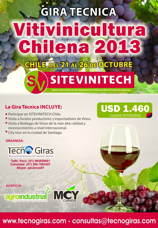 Tecnogiras junto a CITEvid y con la directa colaboración de SITEVINITECH Chile invitan a toda la comunidad vinculada a la vitivinicultura en Latinoamérica (productores, profesionales, empresarios, estudiantes, apasionados por el vino.), a unirse a la “Gira Técnica Vitivinicultura Chilena 2013″, la cual viene a ser una interesante pasantía de 6 días y 5 noches.
