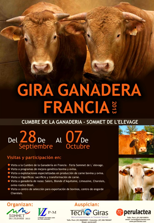 Tecnogiras junto a Perulactea y con la directa colaboración de Consultora Cabinet Victoria Lima de Pre-Mammez, en la persona de su directora Ingeniera Yael Lizárraga de Vuilleminroy invitan a toda la comunidad vinculada a la ganadería bovina en Latinoamérica (productores, profesionales, empresarios, estudiantes, etc.), a unirse a la “Gira Ganadera Francia 2013″, la cual viene a ser una interesante pasantía de 10 días y 9 noches para realizar visitas técnicas a fincas productoras de genética pura en leche y carne; así como la visita a Centrales de Biotecnología e Inseminación Artificial; asistiendo además a la Feria Sommet De L’evage 2013, Industrias Frigoríficas y de Lácteos.