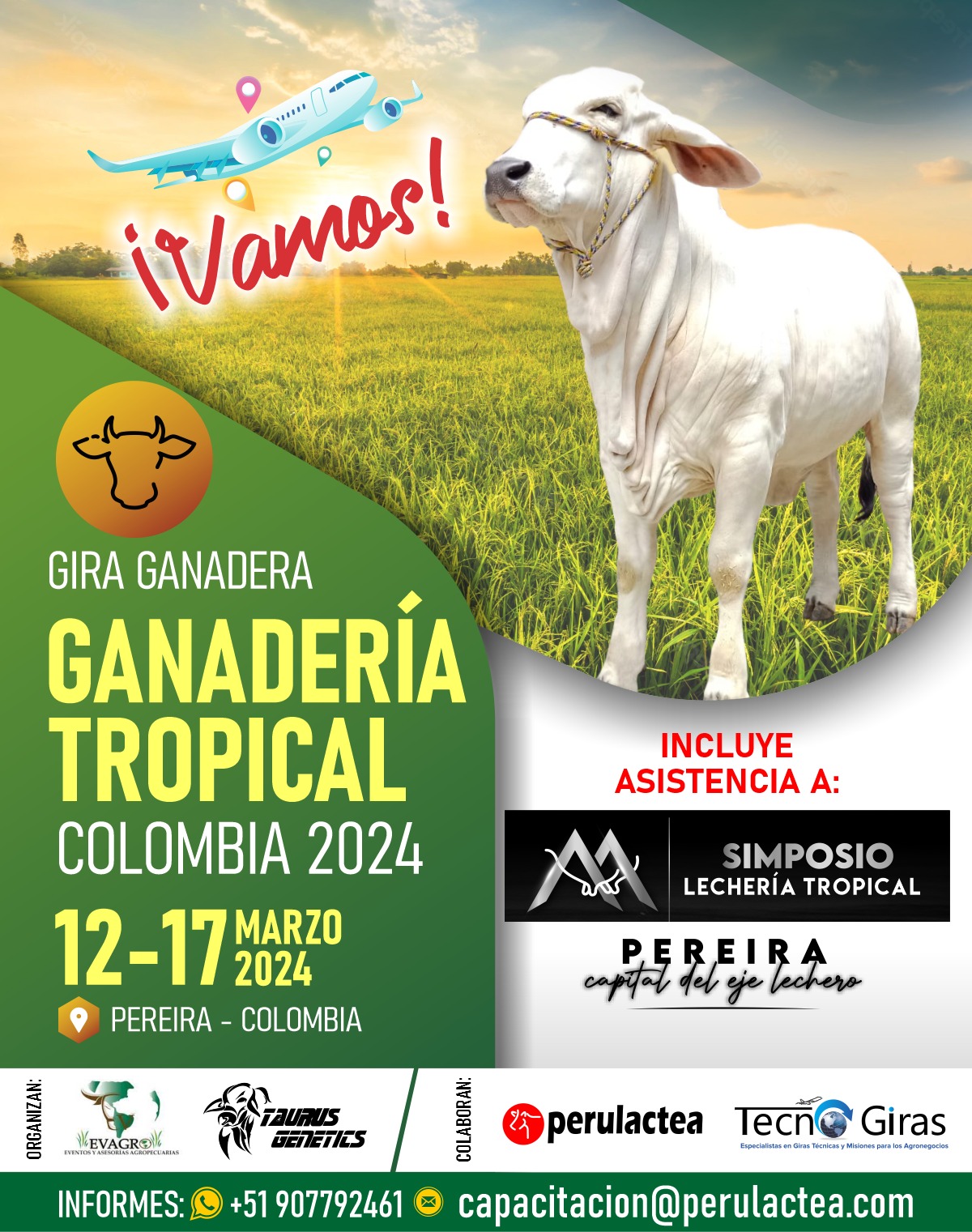La presente Gira Ganadera nos ofrecerá un interesante programa compuesto por múltiples eventos, como las visitas a importantes centros productivos de bovinos lecheros y cárnicos de múltiples razas como: Brahman Blanco, Blond D´Aquitaine, Gyr y Girolando; también podrán asistir al Simposio Lechería Tropical en Pereira CAPITAL DEL EJE LECHERO. Una vez mas Tecnogiras y Perulactea se unen en pro de la capacitación de ganaderos, estudiantes y todos aquellos que quieran pertenecer a este importante sector. No te lo pierdas!!