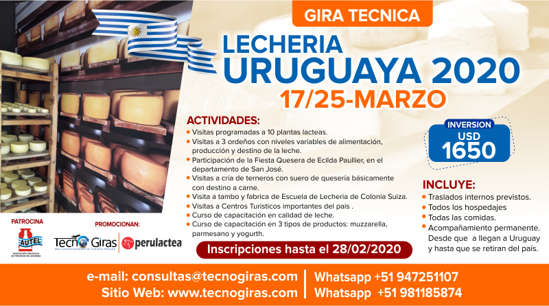 La calidad de leche en Uruguay es mundialmente reconocida en la actualidad exporta alrededor del 75 % de la leche que produce. Se visitarán explotaciones tradicionales, establecimientos de cría, cabañas de genética de ganado de carne y un frigorífico, pudiendo observar los más avanzados sistemas de producción donde el bienestar animal es su principal premisa. Visitaremos una industria láctea, tambos tradicionales, rotativos tipo carrousell y robotizados entre otros. Además se brindará un curso de capacitación donde se tendrá la oportunidad de ampliar más los conocimientos en la industria láctea.